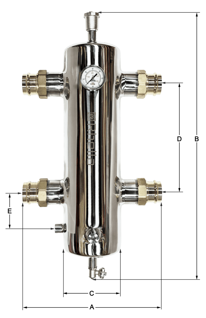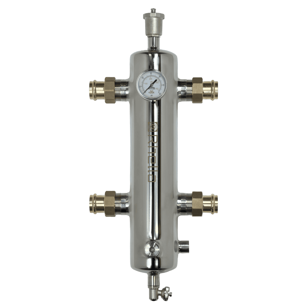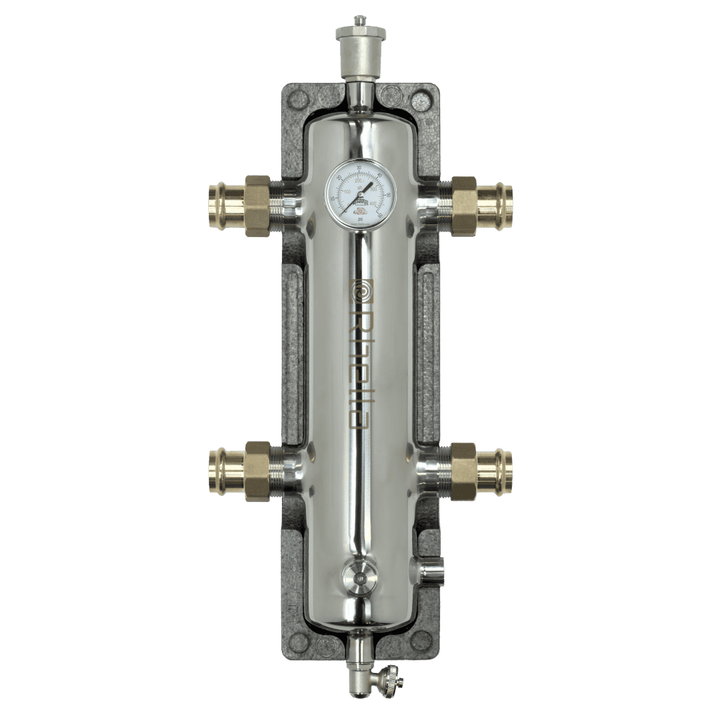 Rhella 4-in-1 Hydraulic Separators are made from high-grade 304 stainless steel for superior corrosion resistance and durability. Designed to provide efficient separation of dirt, air and ferrous particles while maintaining hydraulic separation between primary and secondary circuits. Coalescing media promotes the aggregation of air and micro-bubbles, that are automatically discharged through the automatic air vent. Suspended dirt and debris settle at the bottom for removal through the service drain, while the integrated removable magnetic rod enhances the trapping of ferrous contaminants.