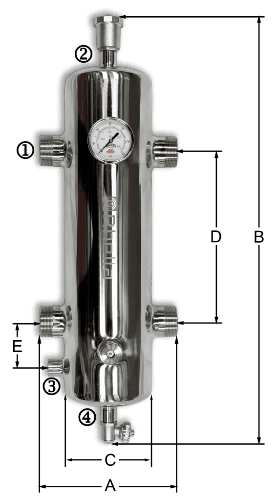 Rhella 4-in-1 Hydraulic Separators are made from high-grade 304 stainless steel for superior corrosion resistance and durability. Designed to provide efficient separation of dirt, air and ferrous particles while maintaining hydraulic separation between primary and secondary circuits. Coalescing media promotes the aggregation of air and micro-bubbles, that are automatically discharged through the automatic air vent. Suspended dirt and debris settle at the bottom for removal through the service drain, while the integrated removable magnetic rod enhances the trapping of ferrous contaminants.