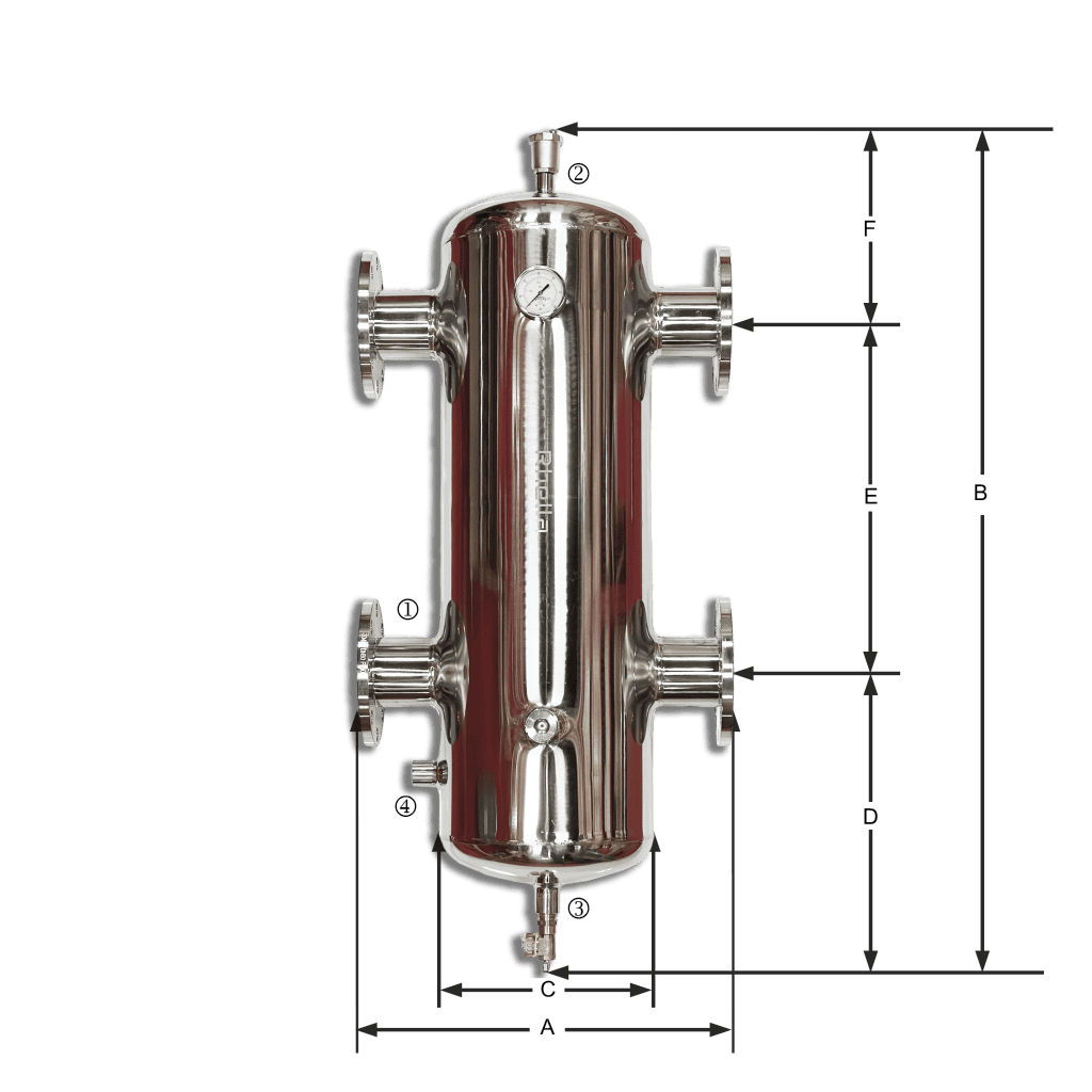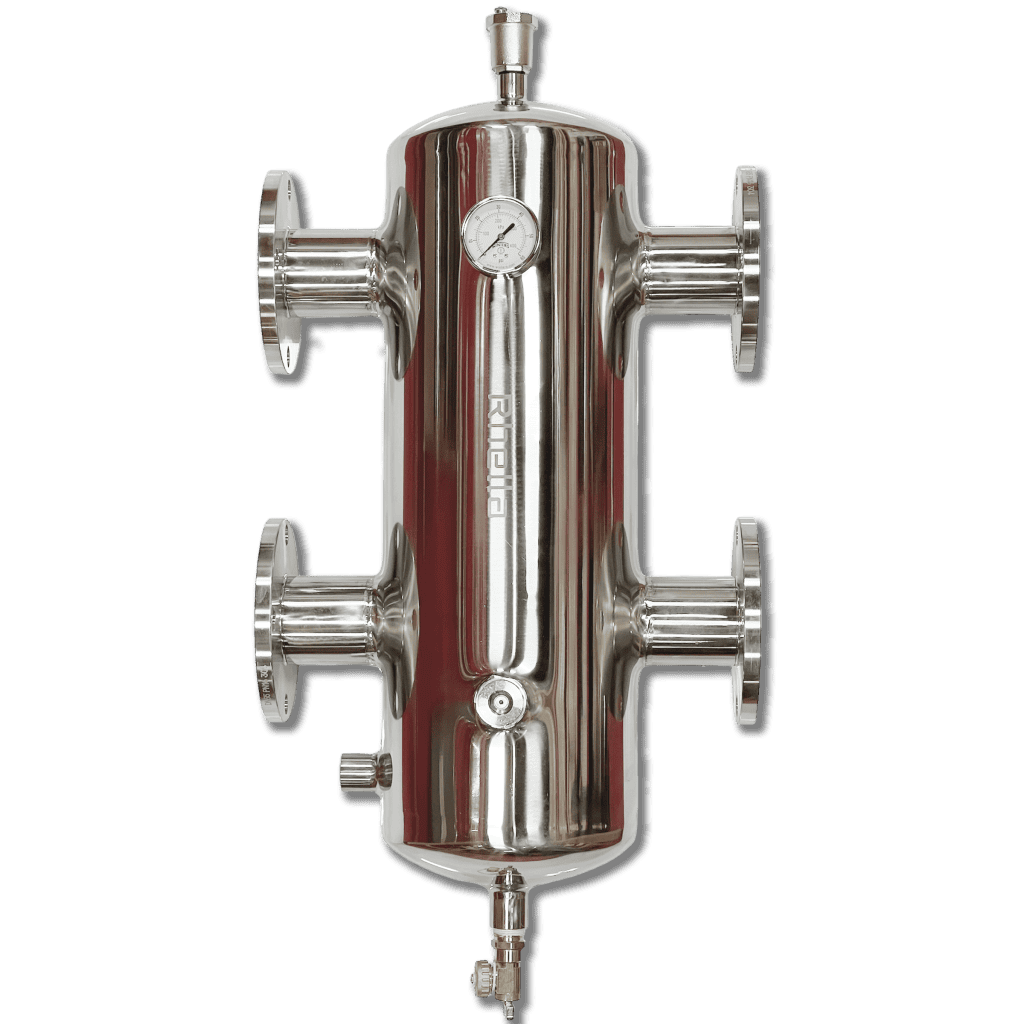 Rhella 4-in-1 Hydraulic Separators are made from high-grade 304 stainless steel for superior corrosion resistance and durability. Designed to provide efficient separation of dirt, air and ferrous particles while maintaining hydraulic separation between primary and secondary circuits. Stainless steel Pall ring coalescing media promotes the aggregation of air and micro-bubbles, that are automatically discharged through the automatic air vent. Suspended dirt and debris settle at the bottom for removal through the service drain, while the integrated removable magnetic rod enhances the trapping of ferrous contaminants.